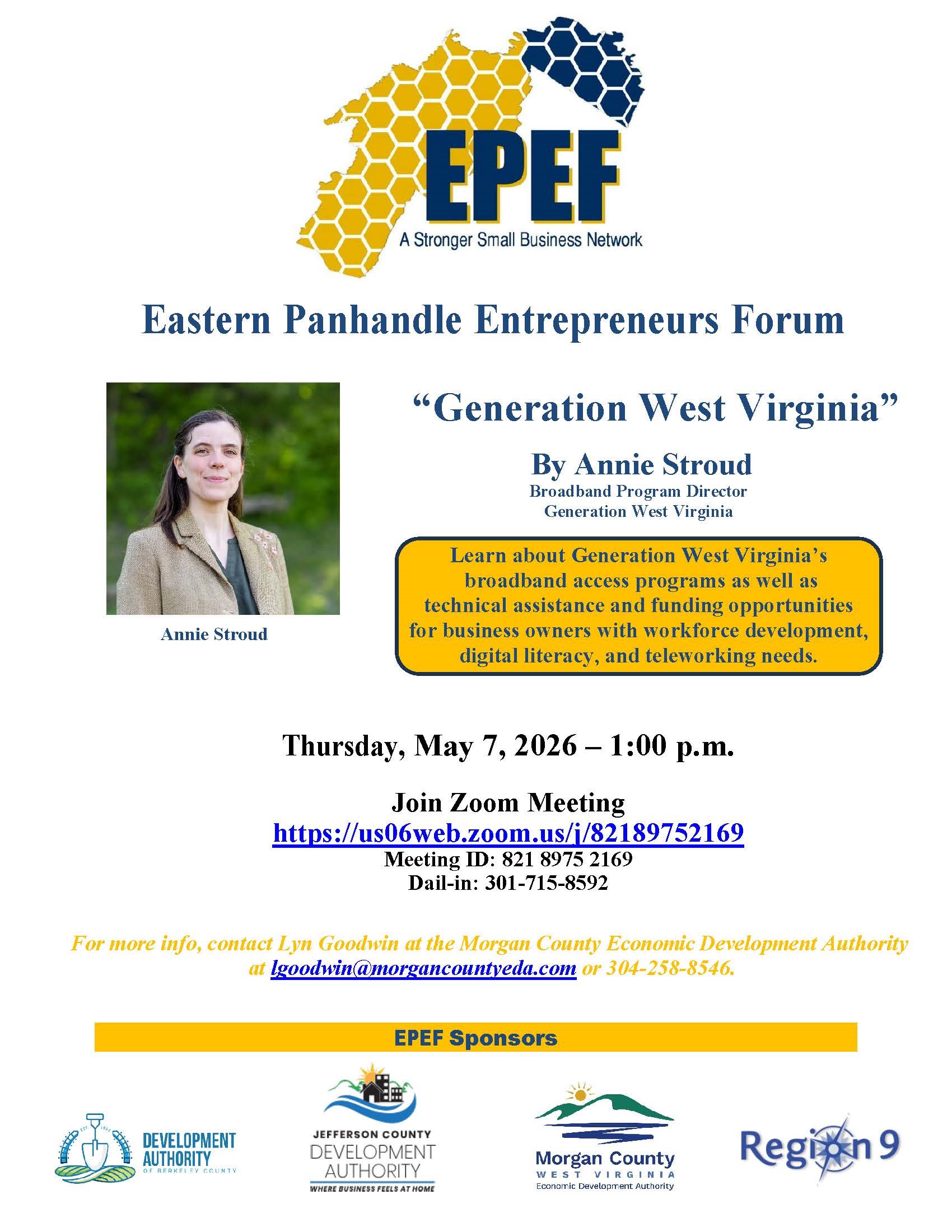 Join us via zoom to Learn about Generation West Virginia's broadband access programs as well as technical assistance and funding opportunities for business owners with workforce development, digital literacy, and teleworking needs.